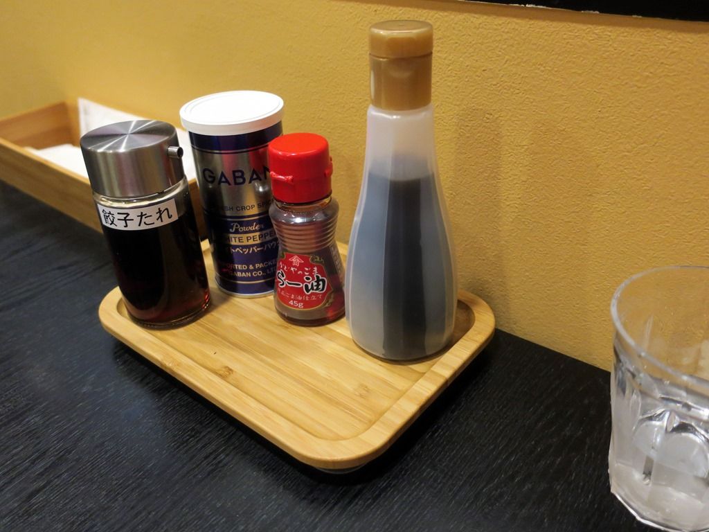 BGMはポップス。箸は割り箸。卓上調味料は醤油、かどやのごま油、GABANホワイトペッパー、餃子のたれ。