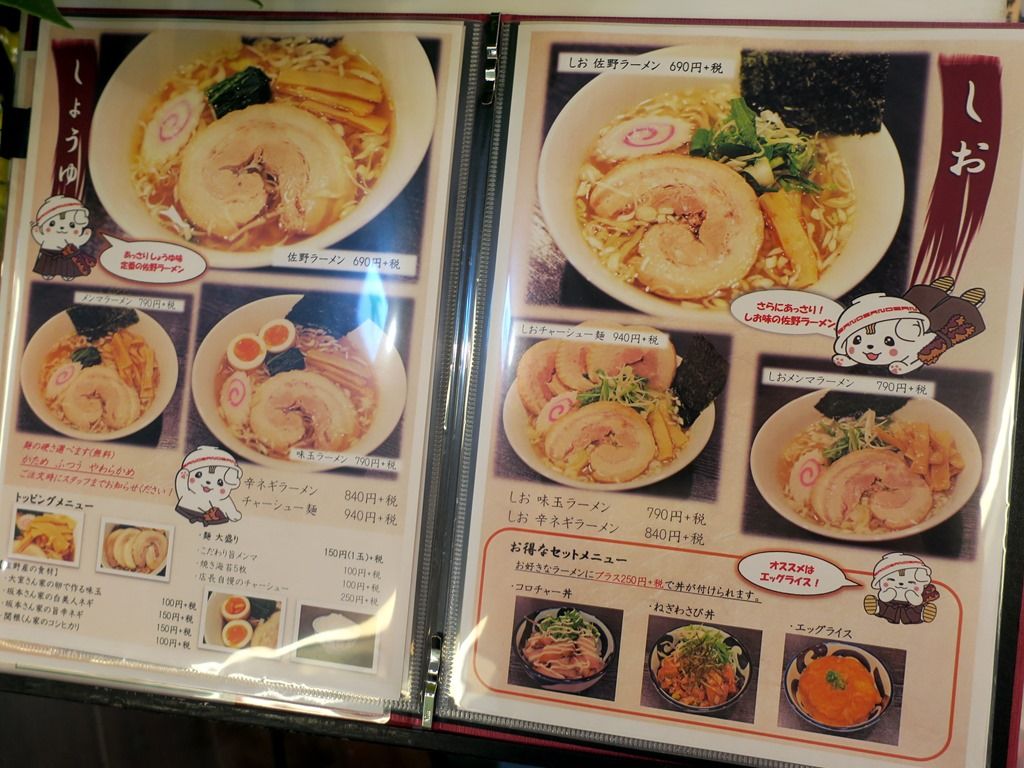 主なメニューは、佐野ラーメン690円、しお佐野ラーメン690円、セットメニュー(コロチャー丼・ねぎわさび丼・エッグライス)+250円、