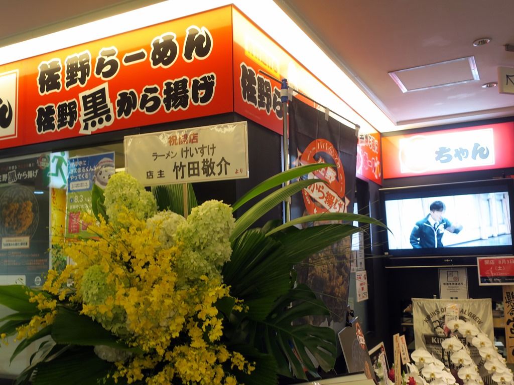 B1店舗前には開店祝花多数。けいすけさんからの花も。