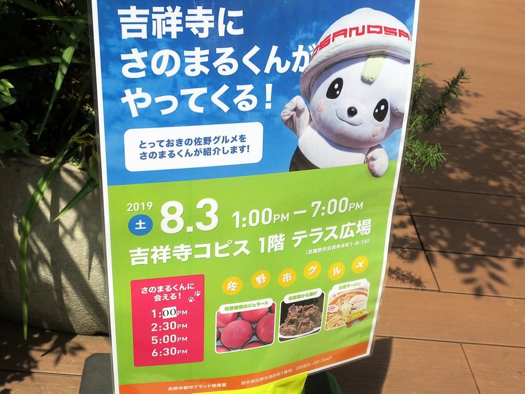 佐野ラーメン店オープンに合わせて、コピス吉祥寺A館正面で、さのまるくんも駆けつけての佐野市グルメの販売イベント開催。