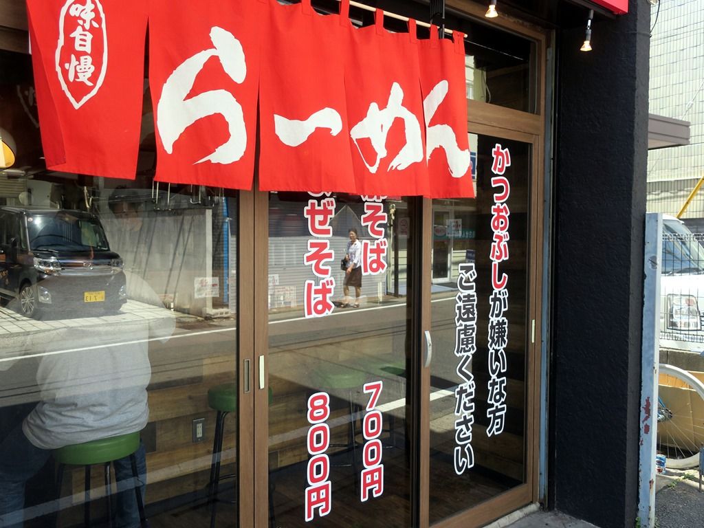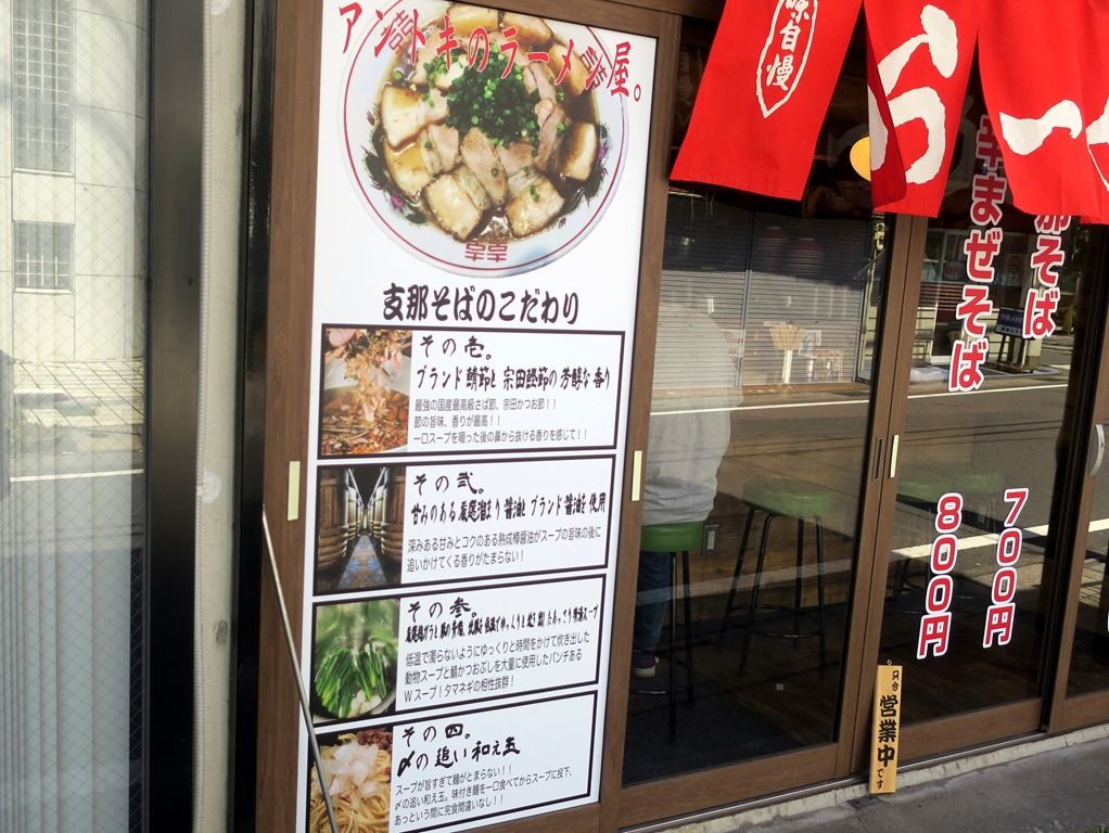 店頭オーニング看板には「かつおぶしのぶりぶりきいた支那そば」、ガラス戸には「かつお節が嫌いな方ご遠慮ください」と。「我がかつお節に一片の悔い無し」と書いてなくて良かった(^_^;)