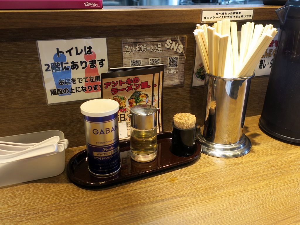 BGMはラップ。箸は割り箸。卓上調味料はGABANホワイトペッパー、酢。
