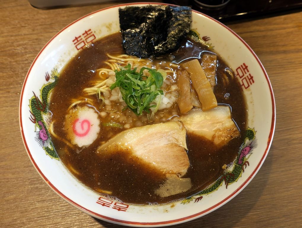 具はチャーシュー、メンマ、なると、海苔、小口切り青ねぎ、みじん切り玉ねぎ。