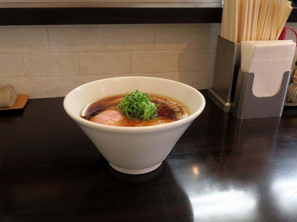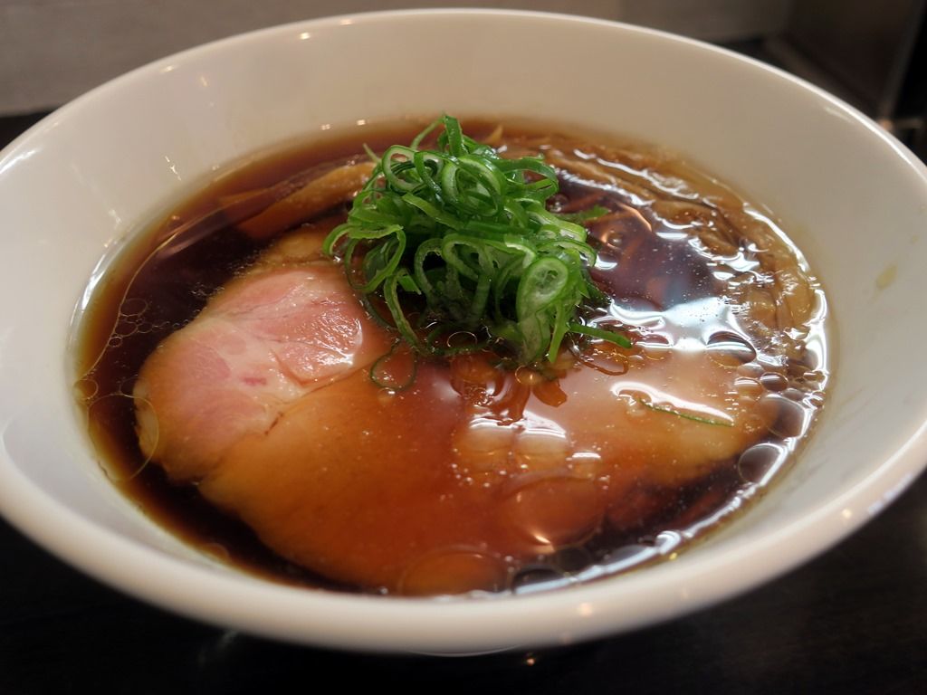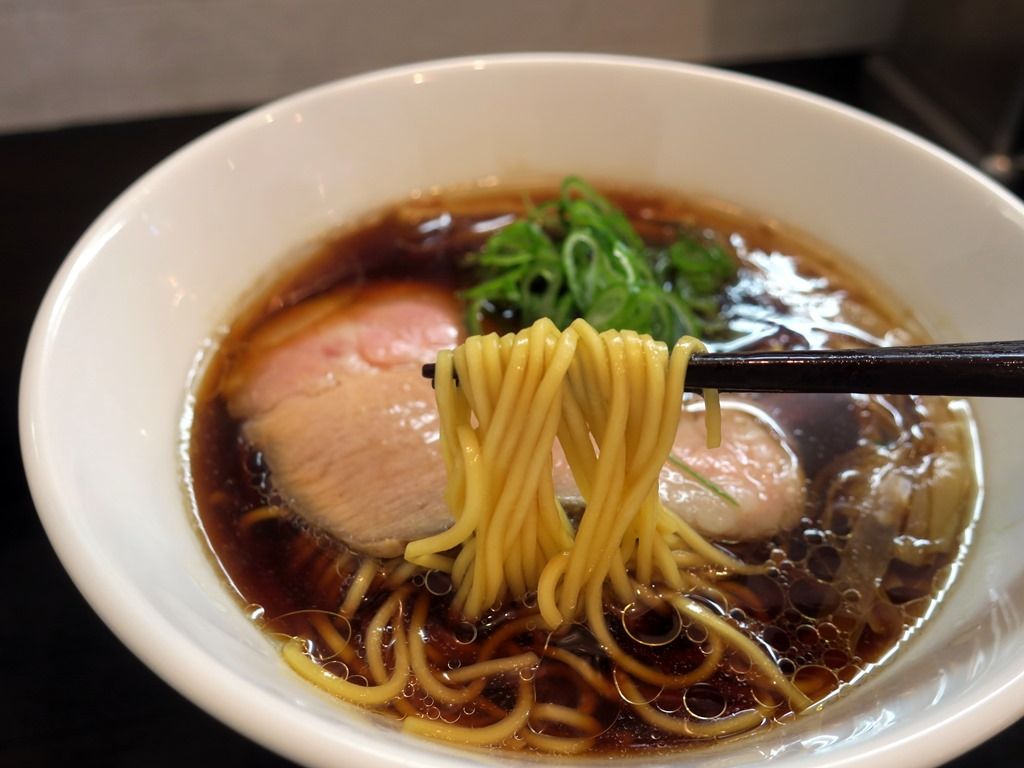 スープはさらさらの清湯醤油味。店頭のポスターによると、「大量の鶏ガラ、大山鶏の丸鶏とRO水で8時間じっくり出汁をとり数種類の醤油タレであわせた中華そば」とのこと。