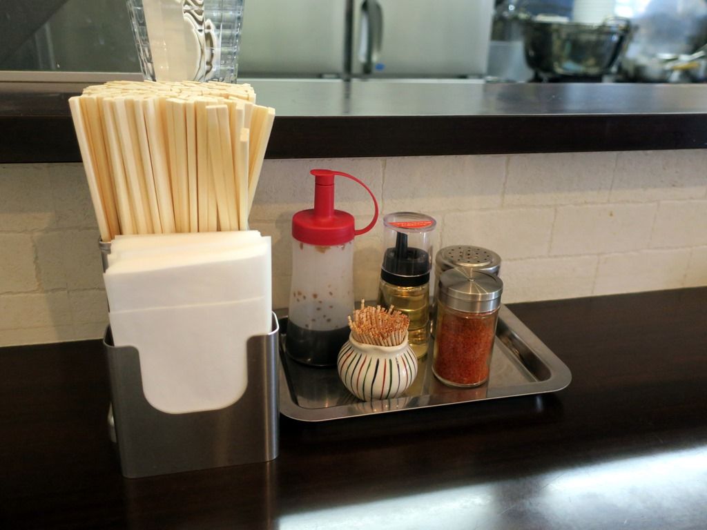 BGMはJ-POP。箸は割り箸。卓上調味料はタレ、酢、一味唐辛子、胡椒。