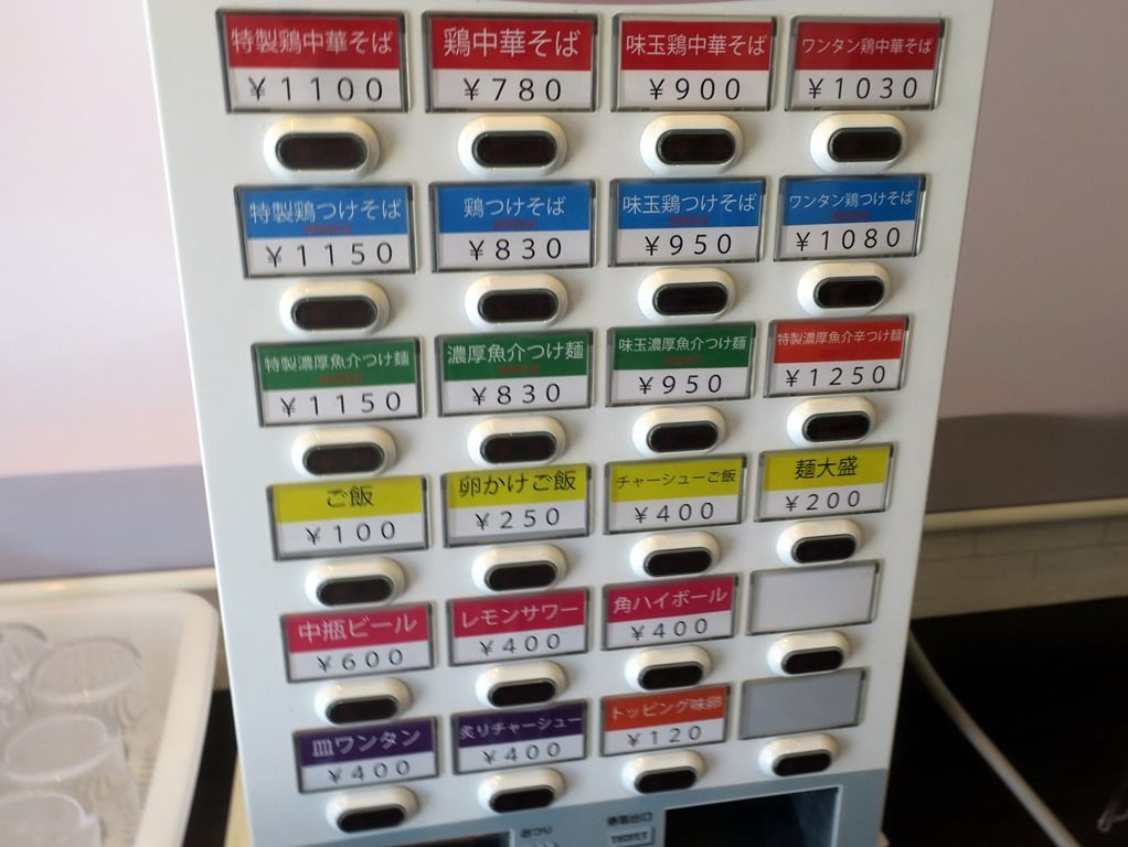 入店すると、まず券売機で食券購入です。主なメニューは、鶏中華そば780円、鶏つけそば830円、濃厚魚介つけ麺830円、卵かけご飯250円、チャーシューご飯400円、他。