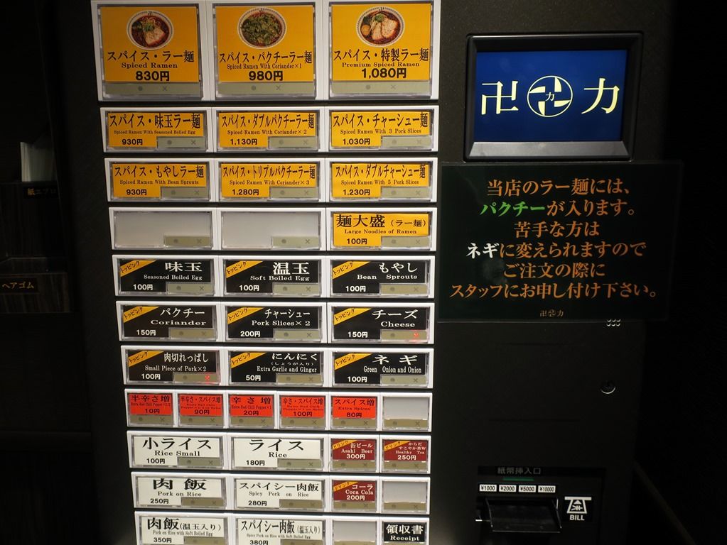 入店すると、まず券売機で食券購入です。主なメニューは、スパイス・ラー麺830円、肉飯250円、スパイシー肉飯280円、他。食券を渡すとパクチーを入れていいか聞かれます。苦手な方はネギに交換。微妙な方は別皿可能。
