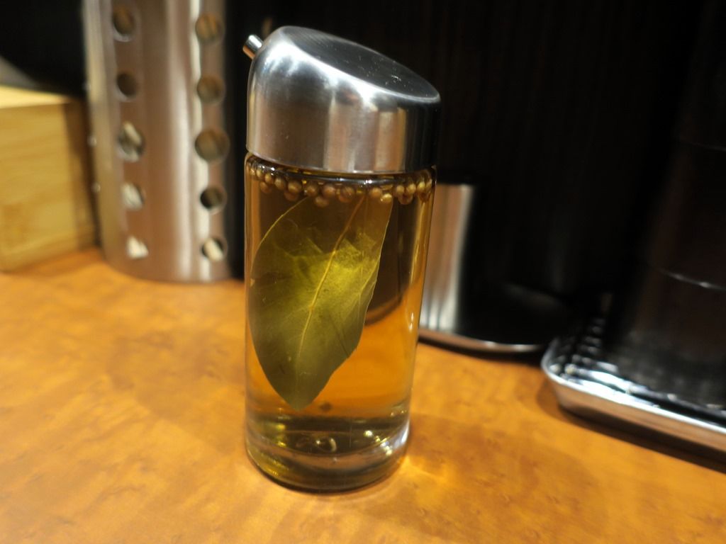卓上調味料はローリエと粒胡椒が漬いたスパイス酢。