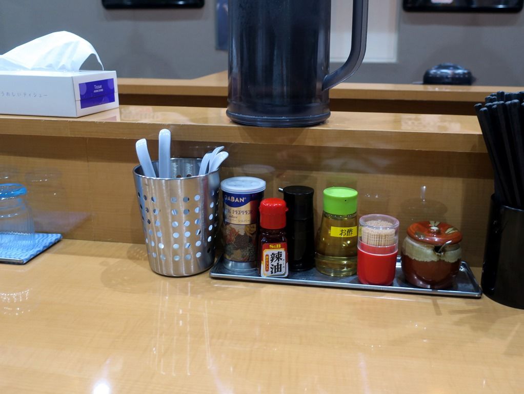 BGMはポップス。箸は洗い箸でエコ仕様。卓上調味料はGABANブラックペッパー、S&Bラー油、醤油、酢、おろしにんにく。