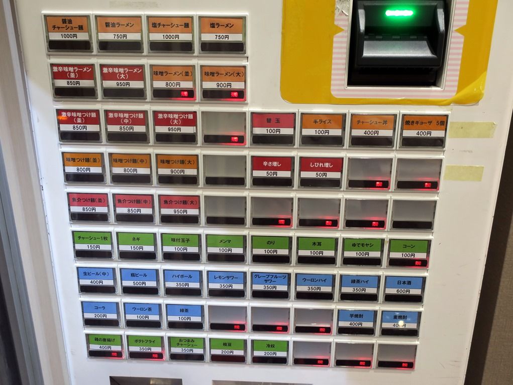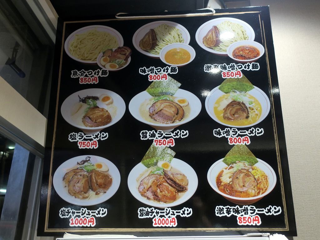 入店すると、まず券売機で食券購入です。主なメニューは、醤油ラーメン750円、塩ラーメン750円、味噌ラーメン800円、激辛味噌ラーメン850円、味噌つけ麺800円、激辛味噌つけ麺850円、魚介つけ麺850円、他。