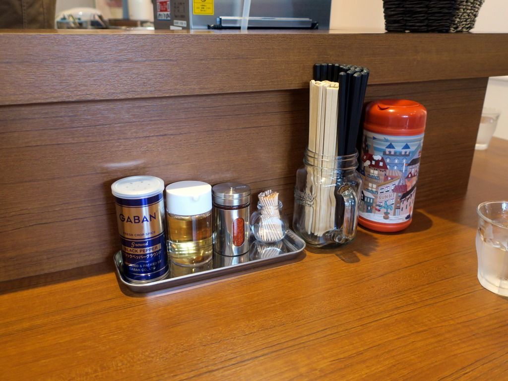 BGMはJ-Pop。箸は割り箸と荒い箸のW装備。卓上調味料はGABANブラックペッパー、酢、一味唐辛子。