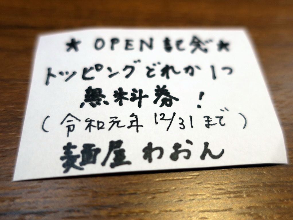 会計後、待ってる間に次回使えるトッピング無料券を貰いました。