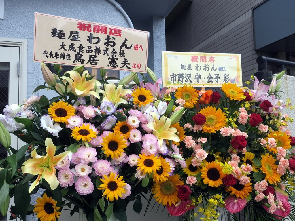 店頭には大成食品からの開店祝花。定刻2分前に早開けオープン。券売機は導入予定ですがまだ間に合ってなくて、この日は入口横に設置された受付で先会計制。