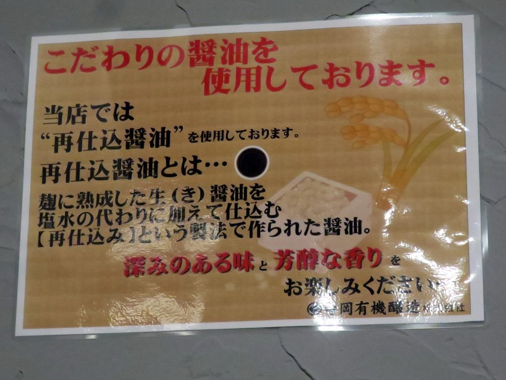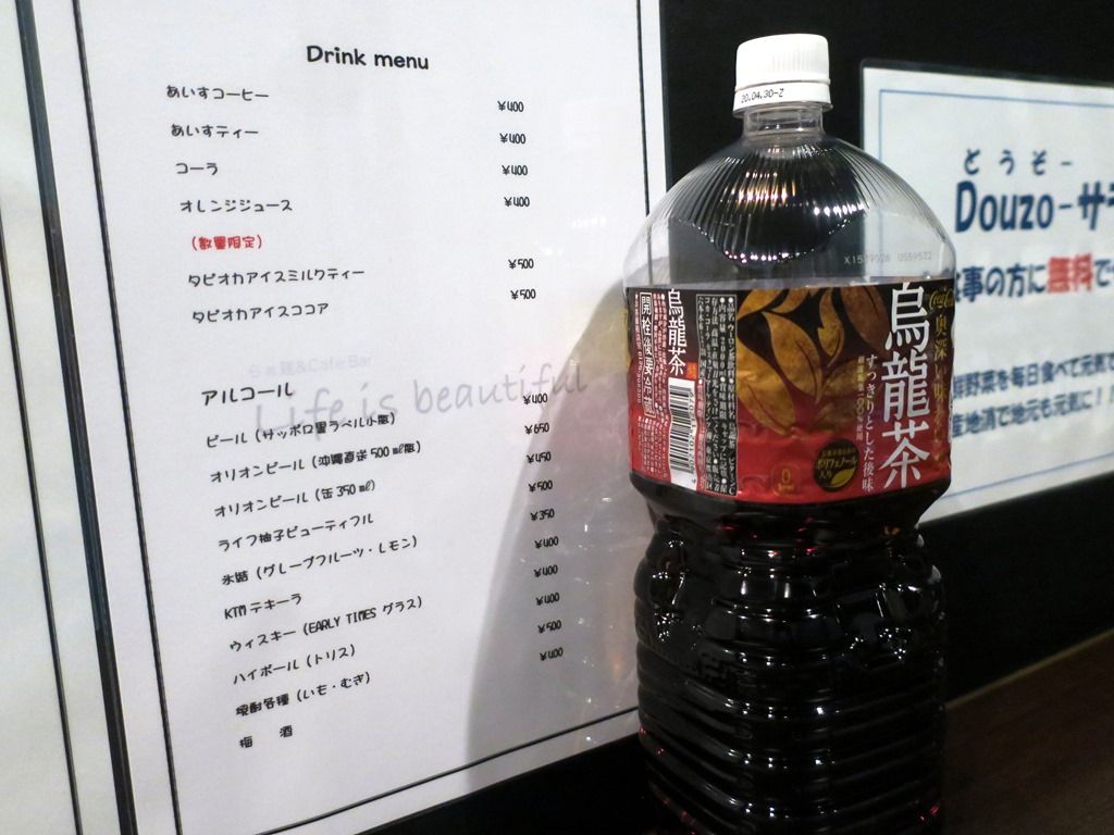 21時頃到着で先客1、後客1。厨房には店主さんと女将さん、息のあったコンビネーションプレイ。BGMはもちろんケツメイシ。箸は店名ロゴ入り箸袋入りの割り箸。卓上調味料は無し。お冷は氷入り保冷タンブラーを渡されて、卓上の烏龍茶や麦茶のペットボトルからセルフで給水。
