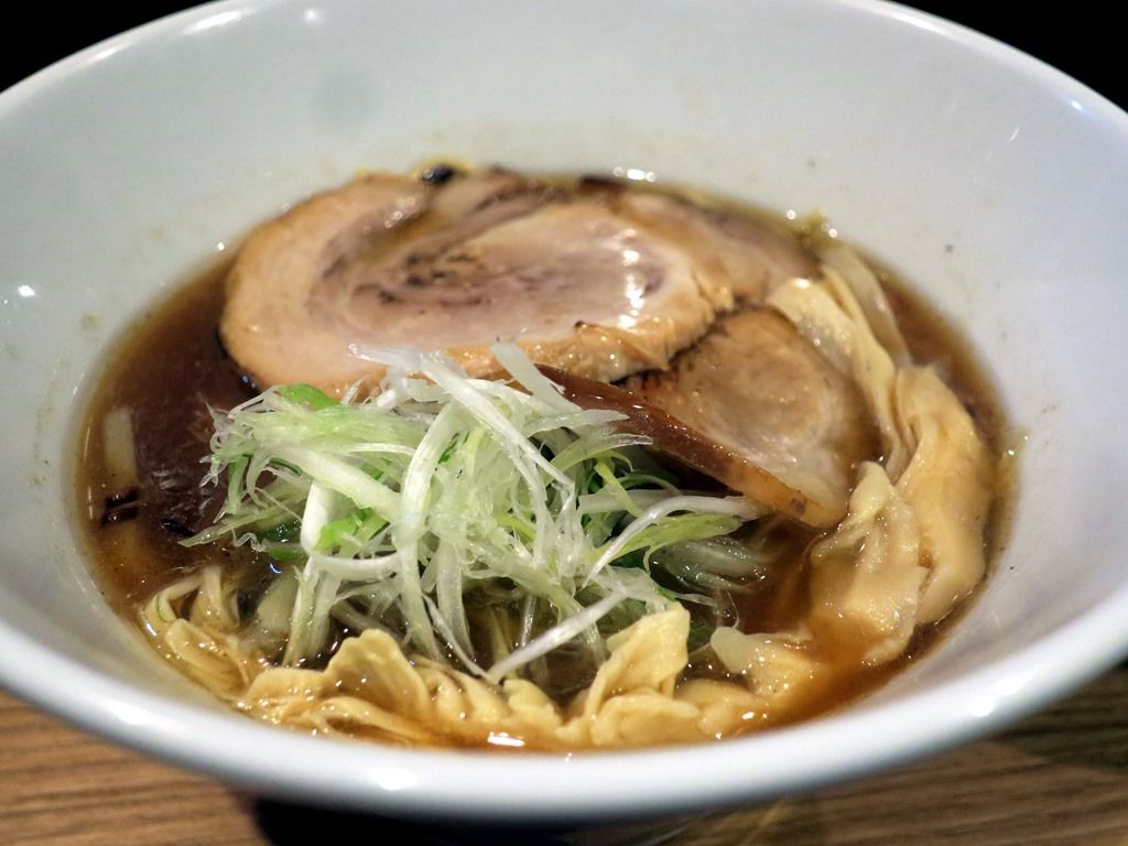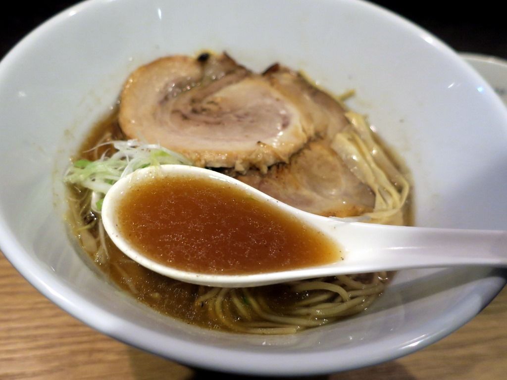 スープはさらさらの清湯醤油味。公式HPによると、鰹節、さば節、煮干、昆布、椎茸からの出汁に、こだわりの再仕込み醤油とのこと。動物性不使用ですが、出汁に奥行きと厚みがあり、自然な甘さと相まって実に奥深い味わい。焦がしネギとネギ油も、香り高く風味豊かな香ばしさを演出。「旨味醤油らぁ麺」を地で行くうま味があって、すごく美味しい!