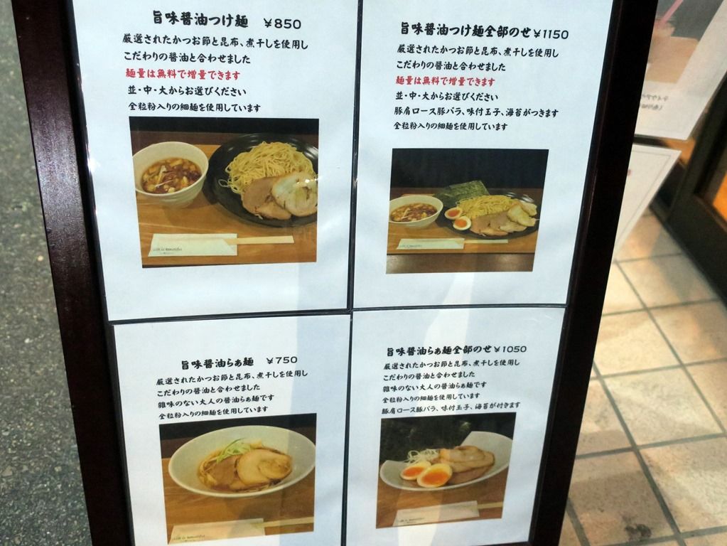 券売機は無く後会計制。主なメニューは、旨味醤油らぁ麺750円、旨味醤油つけ麺850円、他。つけ麺は並200g、中300g、大400g同料金。