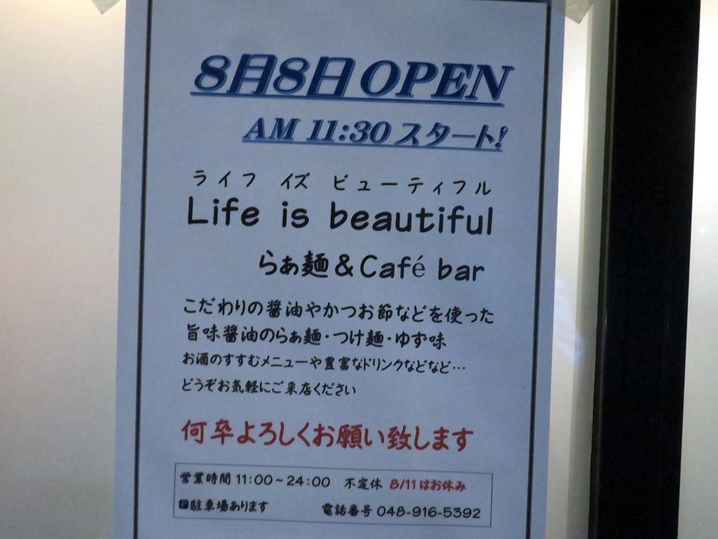 2019年8月29日、新田の新店「Life is beautiful らぁ麺&Cafe'bar」へ。