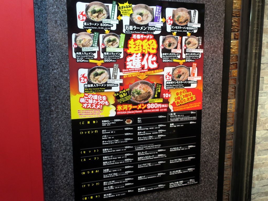入店すると、まず券売機で食券購入です。主なメニューは、石器ラーメン750円、原人ラーメン830円、マンモスラーメン830円、HYOUGA(氷河)ラーメン980円、塩原人ラーメン860円、味噌マンモスラーメン860円、他。