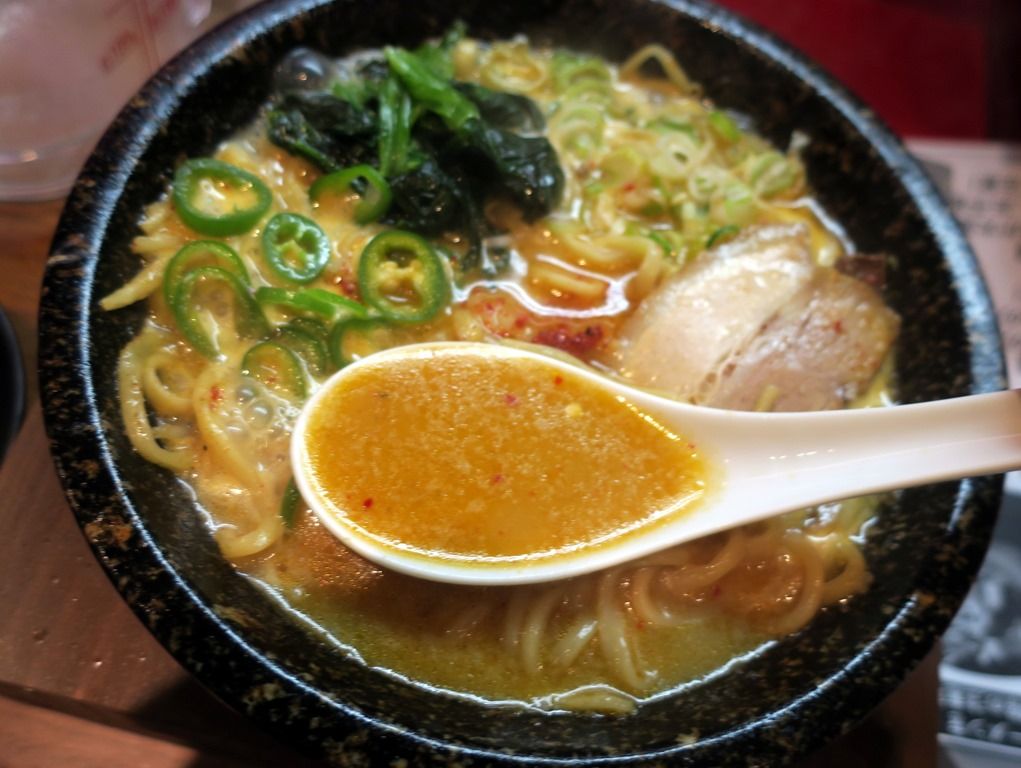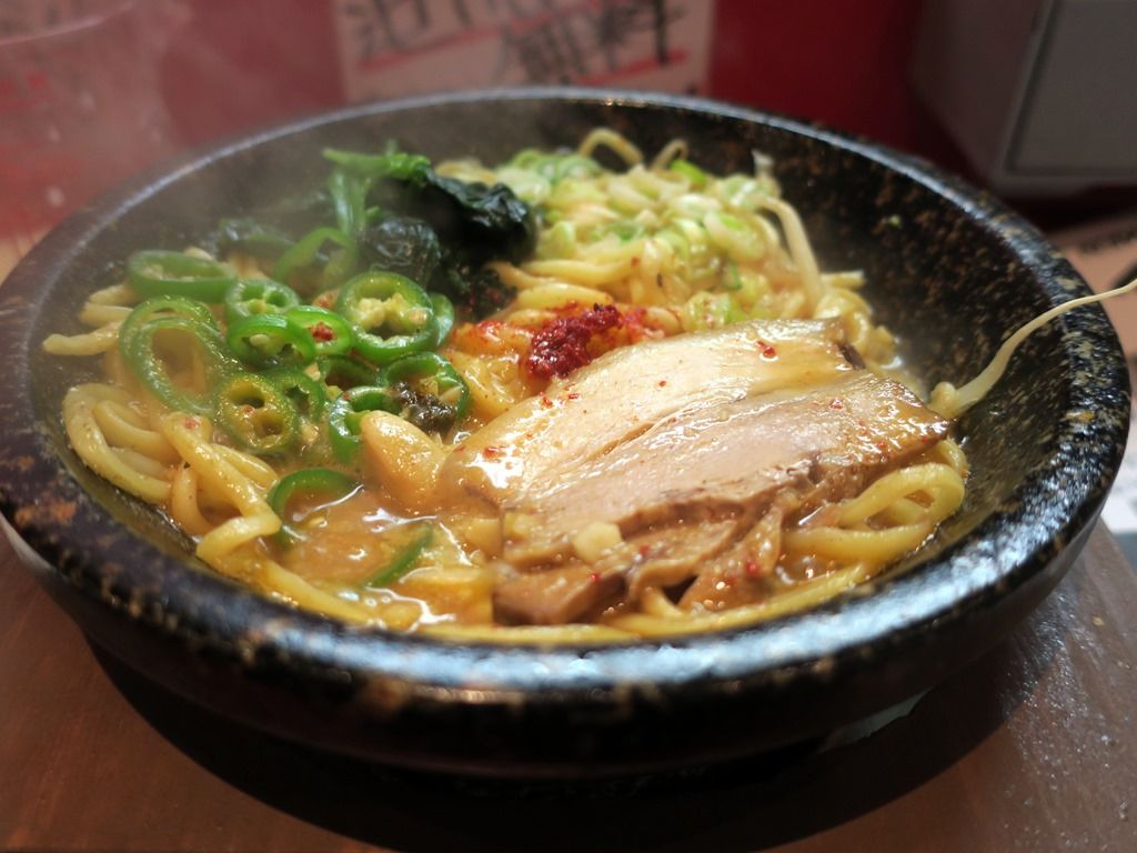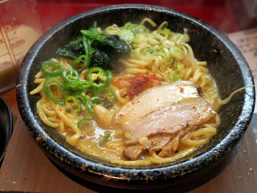 熱すぎてニンニクもマイルド、辛さも穏やかな感じに。沸騰しても風味が損なわれず、重すぎず軽すぎずで食べやすく美味しい!麺はストレート太麺。四谷三丁目で食べた時は、麺がどうしようもなくプアでしたが、きっちり改良されて来ました。長時間沸騰スープで煮込んでもへたらず、鍋底で焦げ付くこともなく、この麺なら鍋焼きラーメンとして楽しめます。