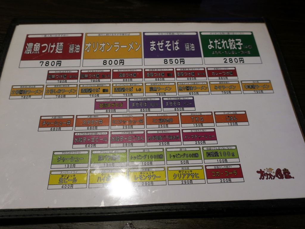 主なメニューは、濃魚つけ麺900円、オリオンラーメン800円、まぜそば醤油800円、2号醤油・しおラーメン780円、清湯鶏そば醤油・しお750円、濃魚ラーメン780円、