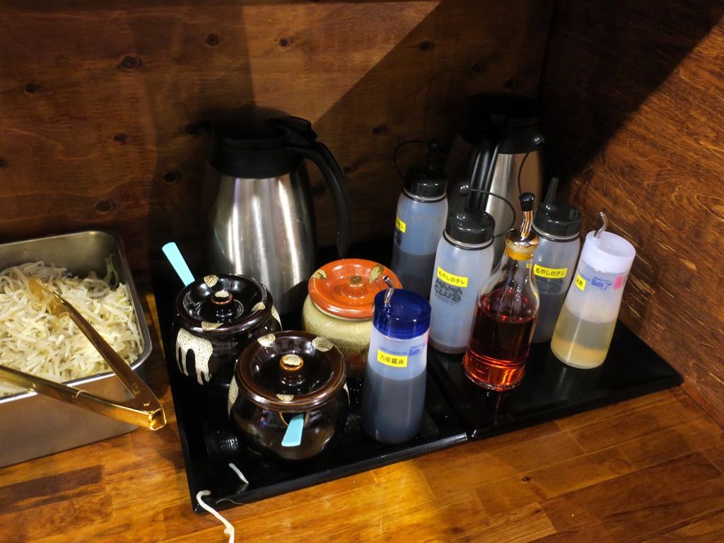 給水機の反対側に調味料などのセルフコーナがあります。そこの調味料は、おろしニンニク、万能醤油、すりごま、もやしのタレ、酢、ラー油。つけ麺用割りスープ、紙エプロン、電子レンジまで完備。