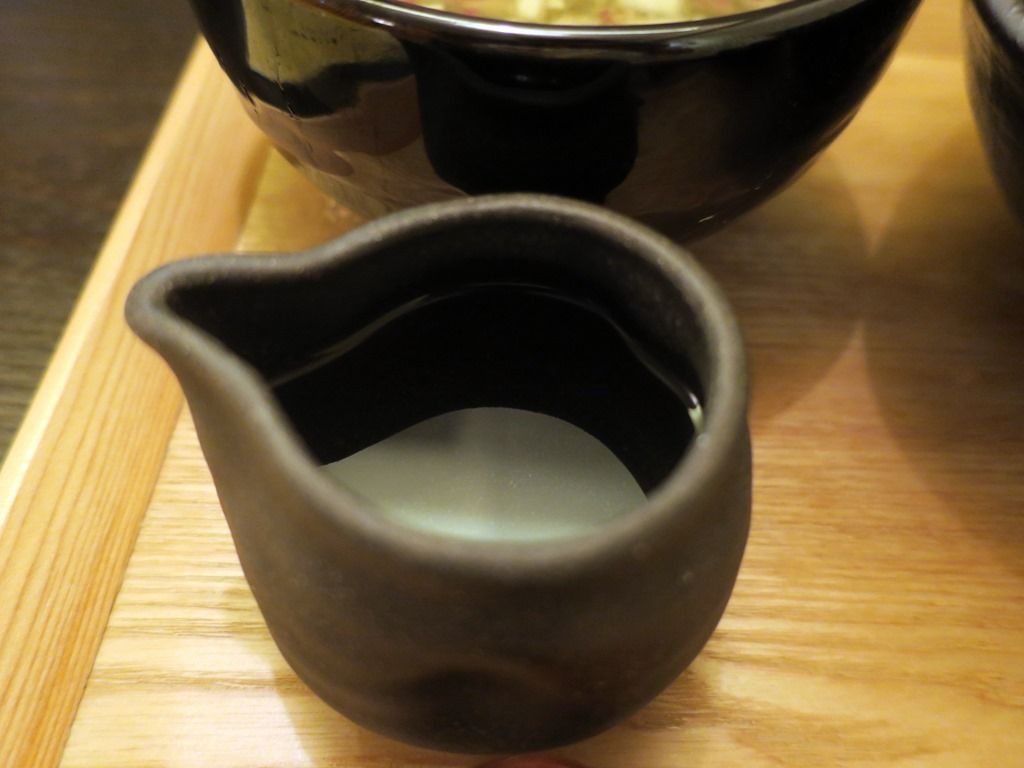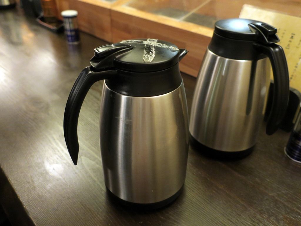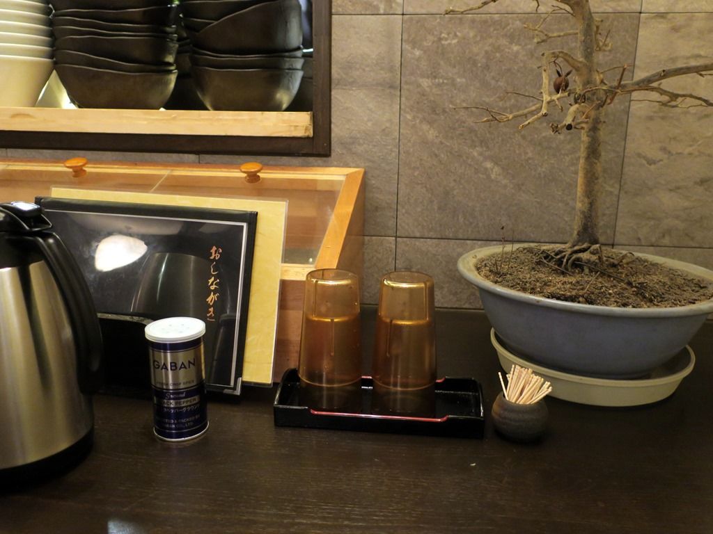 麺を食べ終えたら「追いスープ」をコール。「追いスープ」はポットで提供されますがお冷のと同じポット。目印用にか、上にテープでばつ印してある方が追いスープ用。