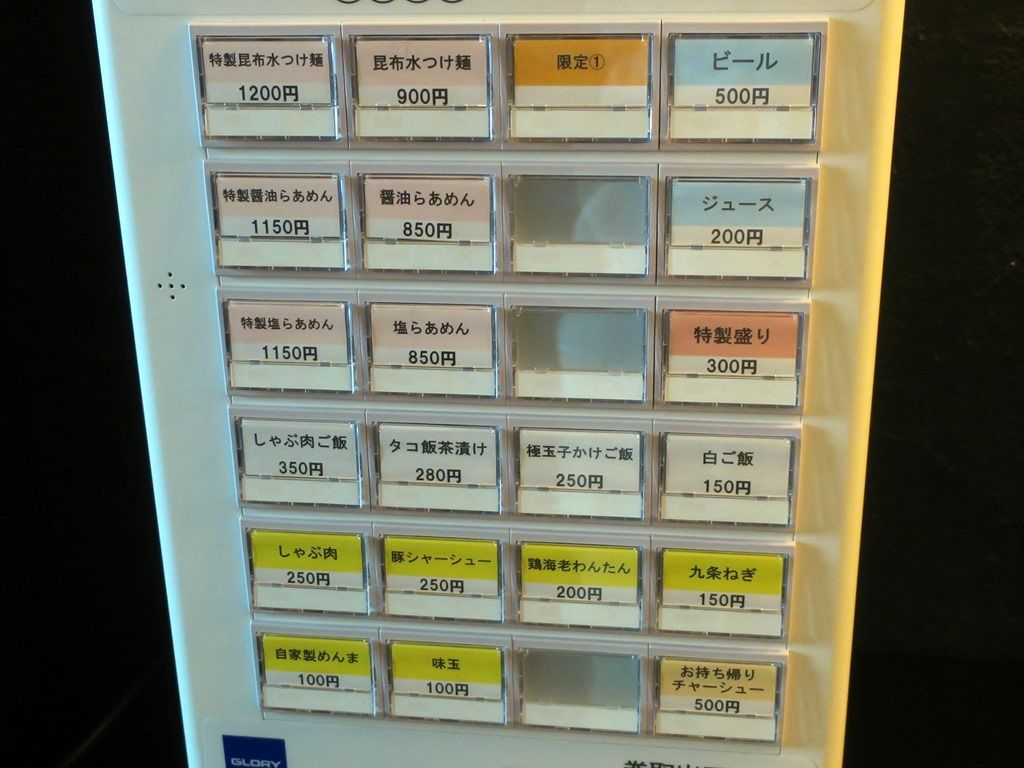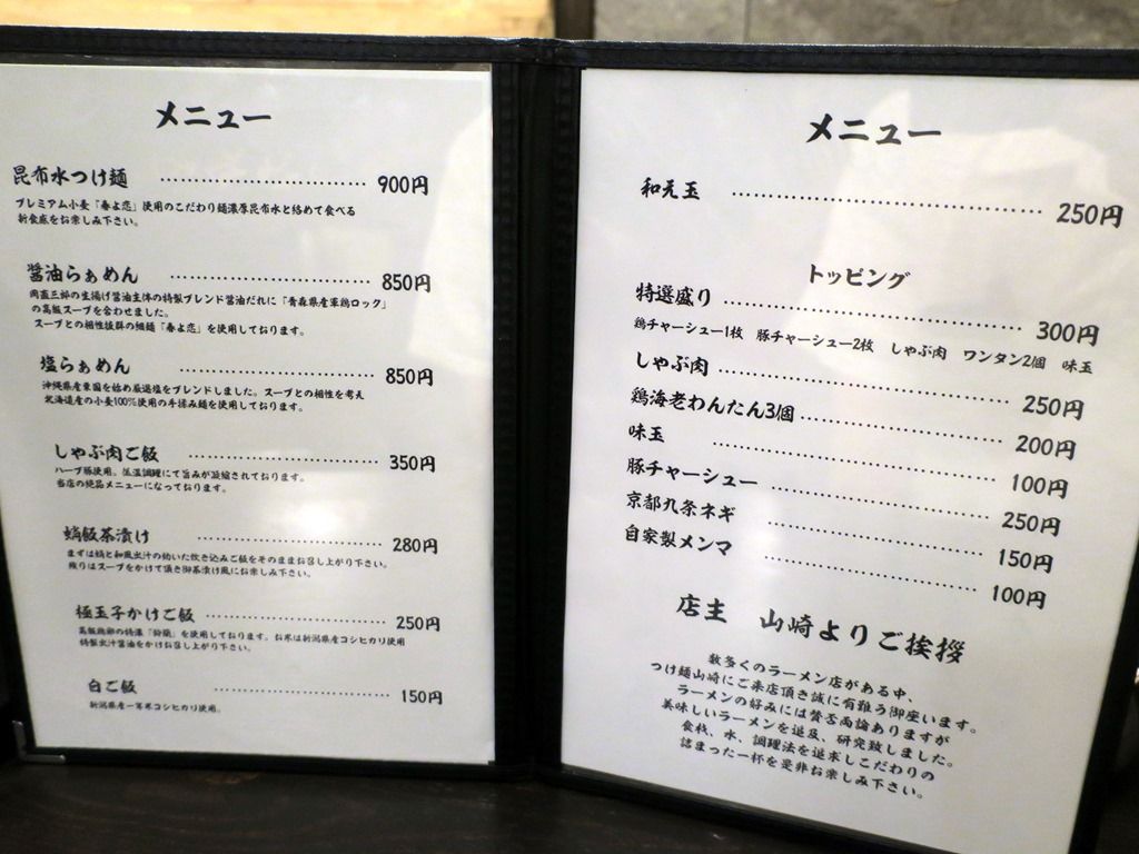 主なメニューは、昆布水つけ麺900円、醤油らぁめん850円、塩らぁめん850円、和え玉250円、しゃぶ肉ご飯350円、蛸飯茶漬け280円、極玉子かけご飯250円、他。