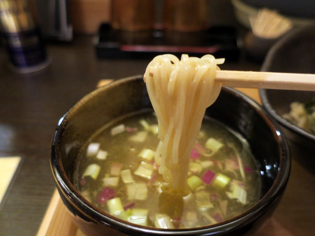 つけ汁はさらさらの清湯塩味。メニュー裏のこだわり食材によると、シャモロックと大山鷄かと。やや塩角が立ち気味ですが、旨味たっぷりで塩つけ麺の教本に載せたくなる味わい。