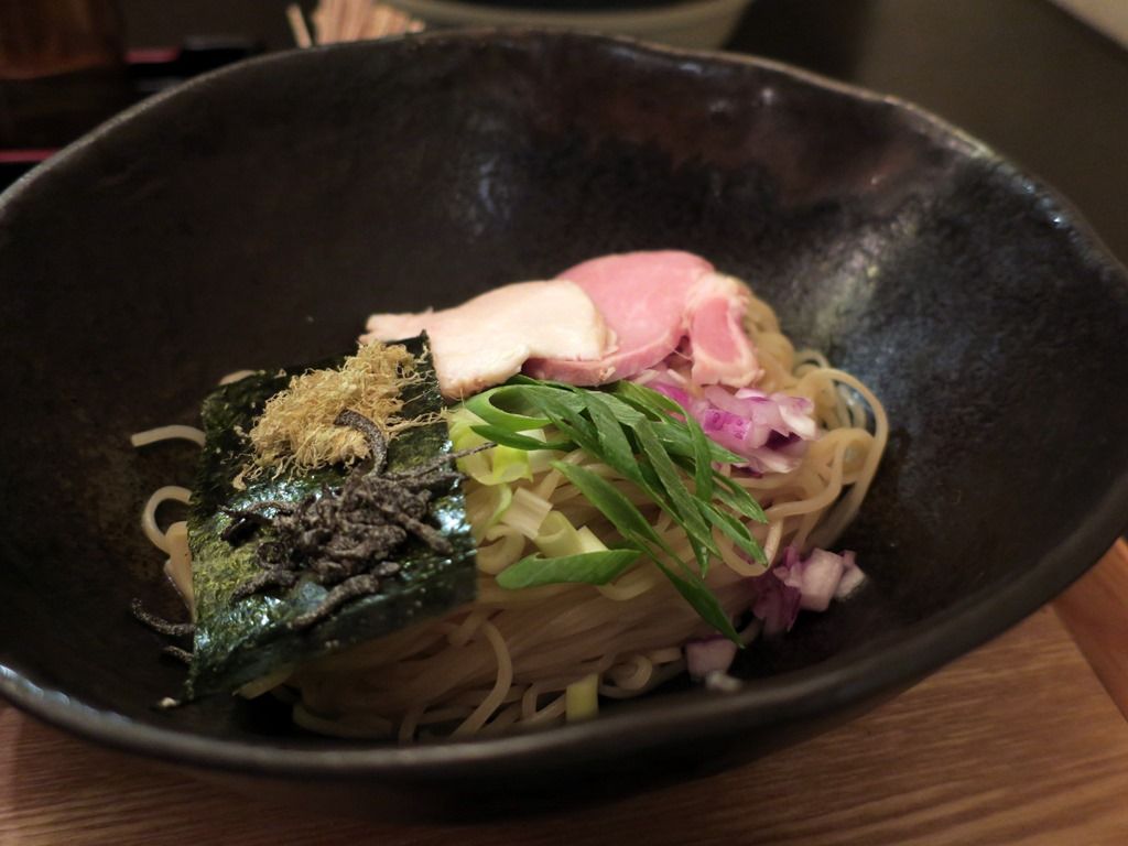 具は麺の上に低温調理の豚チャーシュー、鷄チャーシュー、海苔にとろろ昆布、笹切り九条ねぎ、紫玉ねぎ。つけ汁にきざみねぎと紫玉ねぎ。