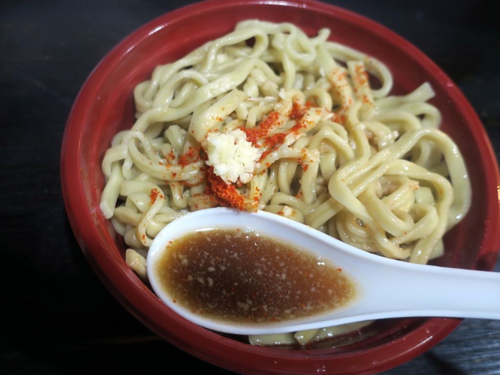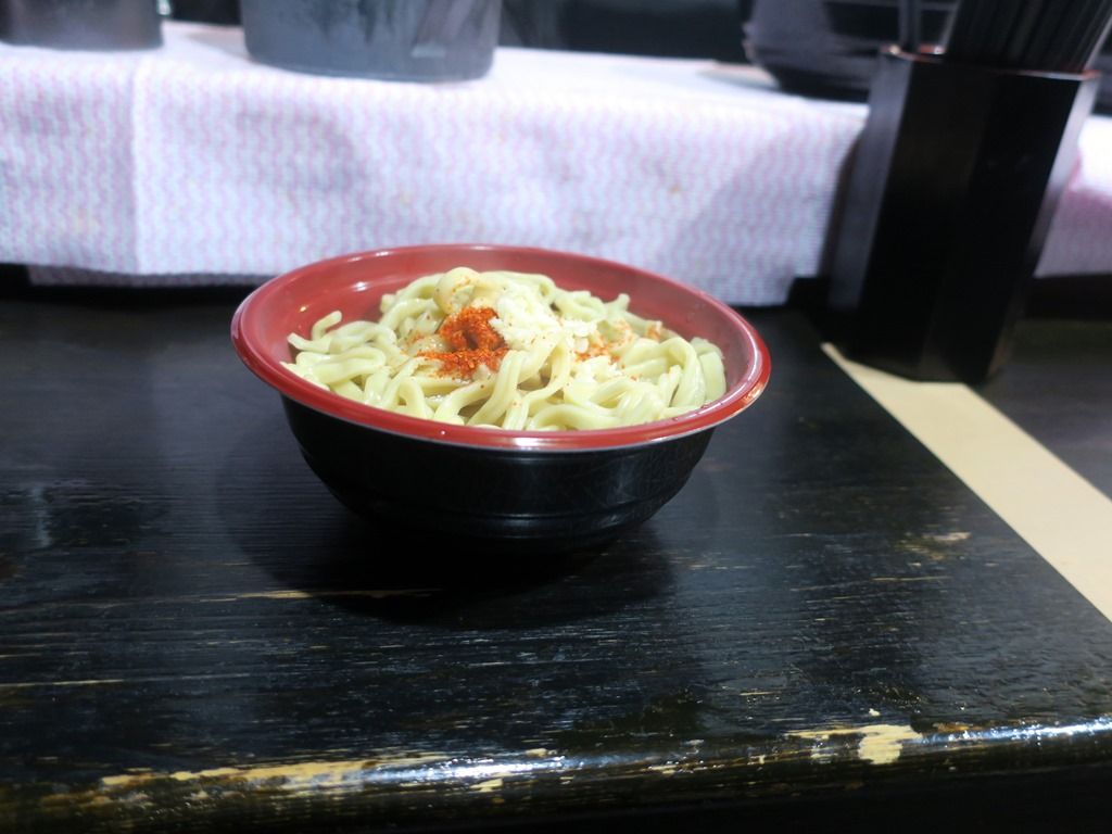 麺は平打ちのストレート極太タイプ。麺量200g。製麺所に希望を伝えて特注だそうですが、製麺所名は内緒とか。この麺がまた旨くて、固めで剛性の高い質感が持ち味。麺とスープをシンプルに味わうかけラーメンでは麺が肝ですが、この麺ならまぜやつけでも食べてみたいです。