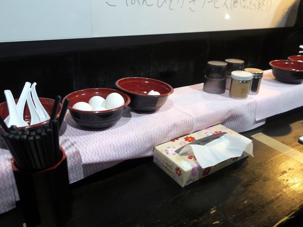 BGMは無し。箸は洗い箸でエコ仕様。卓上調味料は一味唐辛子、カレー粉。
