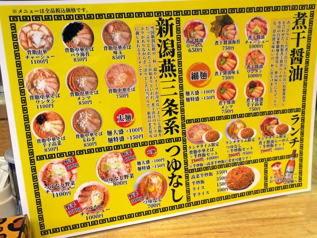 券売機は無く伝票方式、食後レジにて後会計制。主なメニューは、背脂中華そば750円、煮干醤油味玉750円、つゆなし700円、半炒飯350円、他。