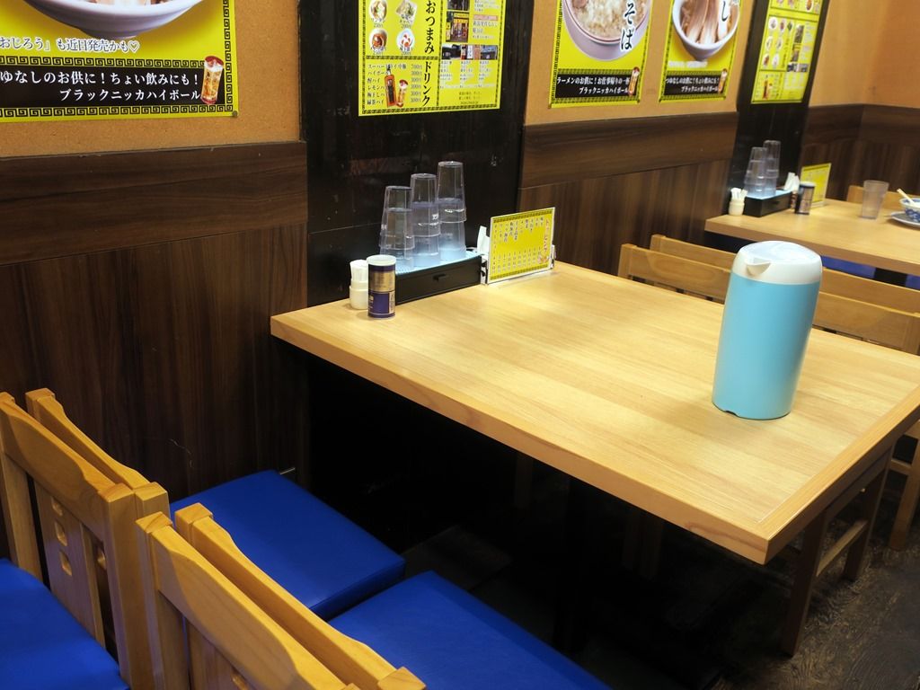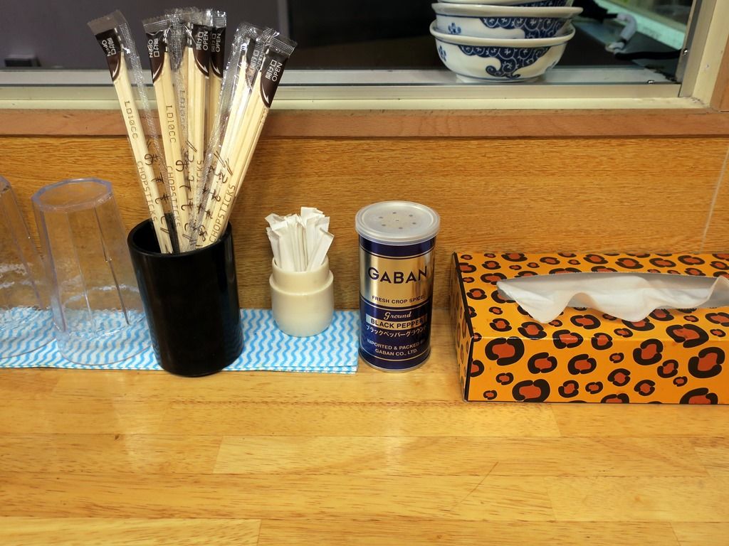 BGMはJ-POP。箸は割り箸。卓上調味料はGABANブラックペッパー。
