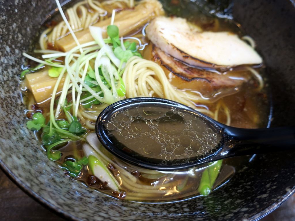 スープはさらさらの清湯醤油味。今日みたいに寒い日は嬉しい熱々での提供。公式ツイ垢のプロフによると、「国産親鶏ガラと豚ゲンコツ、数種の煮干しと節と昆布でスープを取り!たまり醤油ベースタレと仕上げにネギ油」とのこと。ネギ油と揚げネギが実に香ばしく芳しい風味と豊かなコクを演出。香味油のインパクトが絶大ですが、ベースのスープも動物と魚介出汁のハーモニーが実に見事。思わずもう一口が止まらない味わいですごく美味しい!