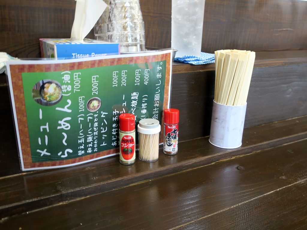 店内は、厨房を囲むL字型カウンター8 先(6席・2席)。後客6。厨房には店主さん、ワンオペ体制。BGMは無し。箸は割り箸。卓上調味料はS&Bコショー・七味唐辛子。