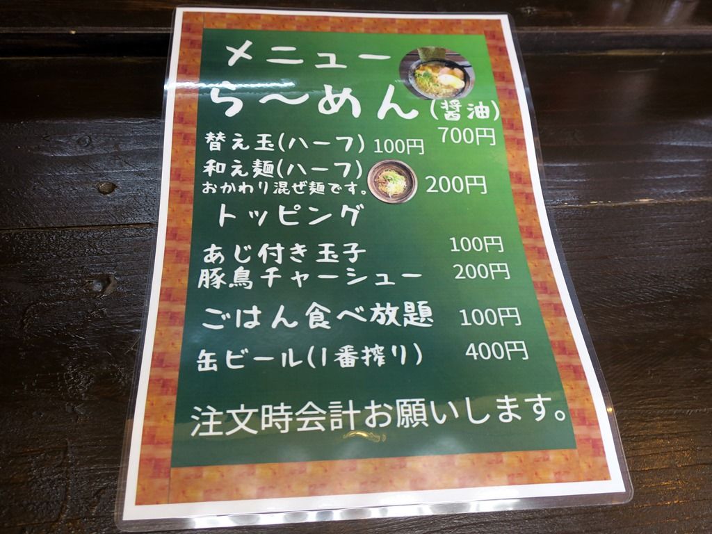 券売機は無く先会計制。主なメニューは、ら~めん(醤油)700円、替え玉ハーフ100円、和え玉ハーフ100円、ごはん食べ放題100えん、他。こはんは奥のジャーからセルフで。