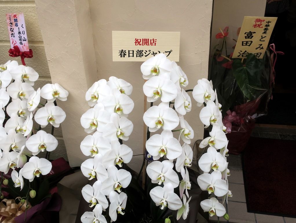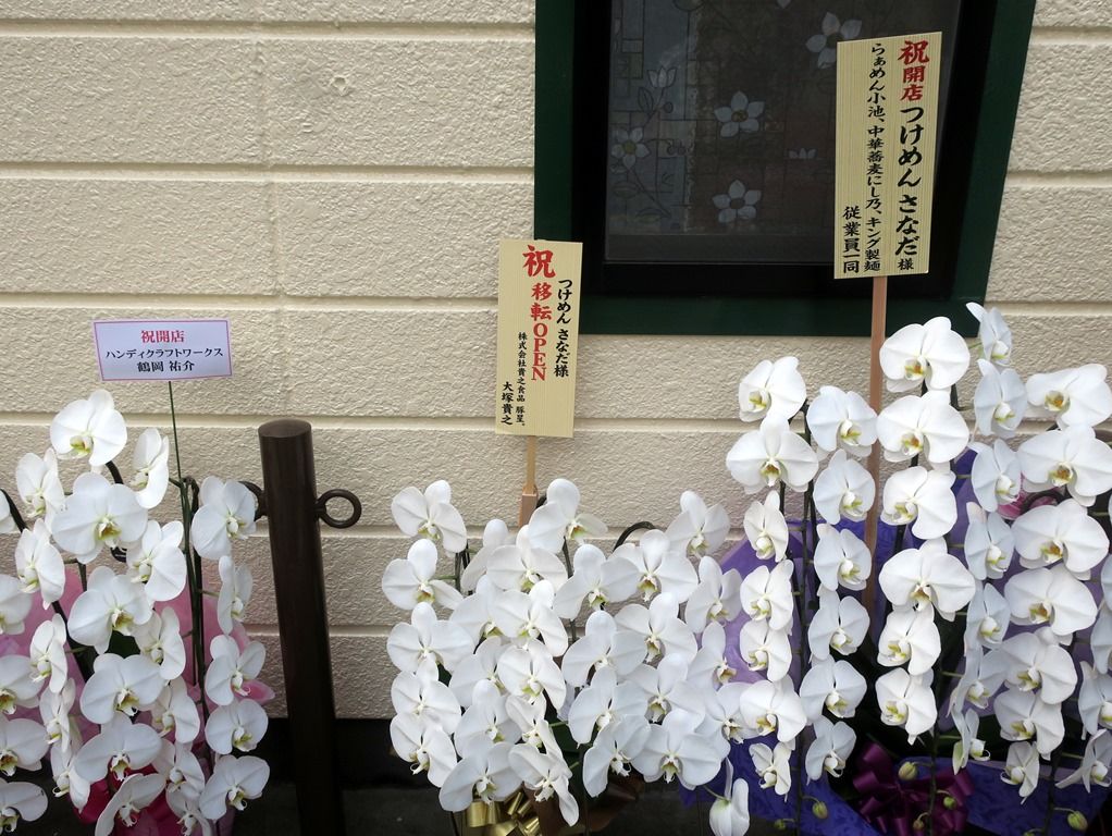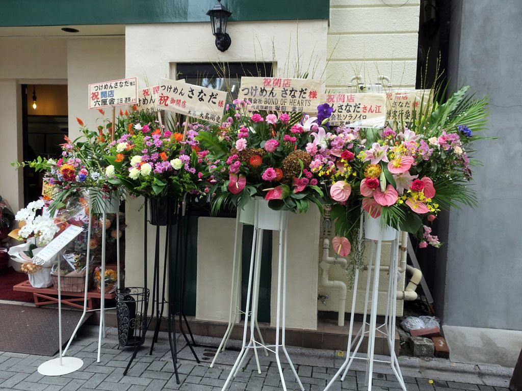 店頭には開店祝の胡蝶蘭・祝樹・祝花多数。気づいたところでは、六厘舎、大島、ボンドオブハーツ、ソラノイロ、大つけ麺博実行委員会、陽はまたのぼる、鈴ノ木