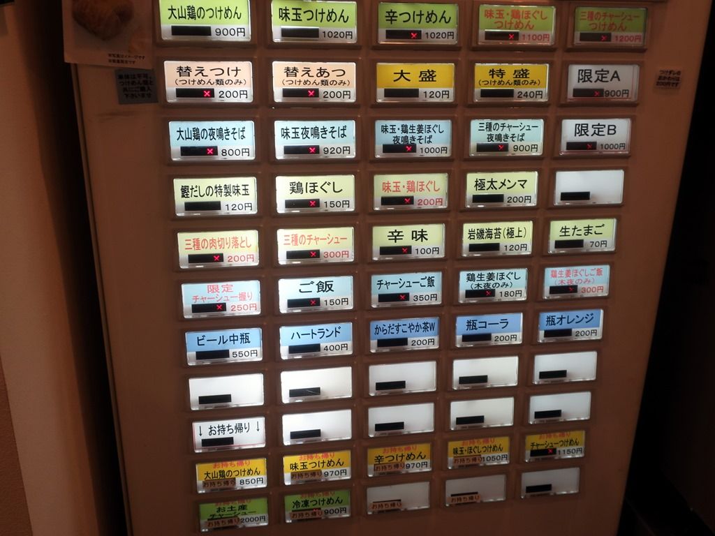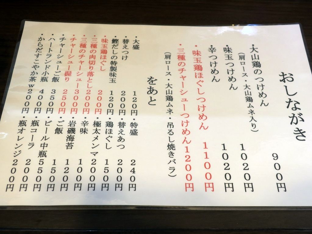 主なメニューは、大山鶏のつけめん900円、辛つけめん1020円、替えつけ200円、替えあつ200円、大山鶏の夜鳴きそば800円、他。25~27日は100食限定売切れ終了。麺メニューは大山鶏のつけめんのみ。