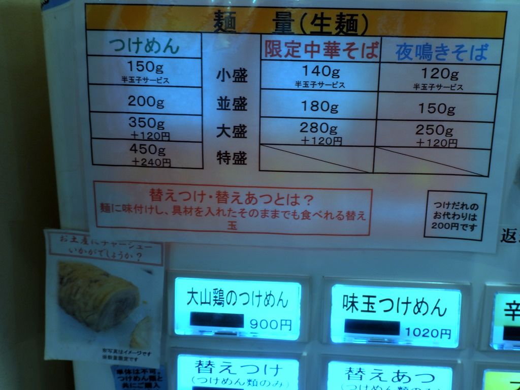 麺量は、つけめんが小盛150g半玉子サービス、並盛200g 大盛350g 特盛450g、限定中華そばが小盛140g半玉子サービス、並盛180g、大盛280g、夜鳴きそばが並盛120g半玉子サービス、並盛150g、大盛250g。