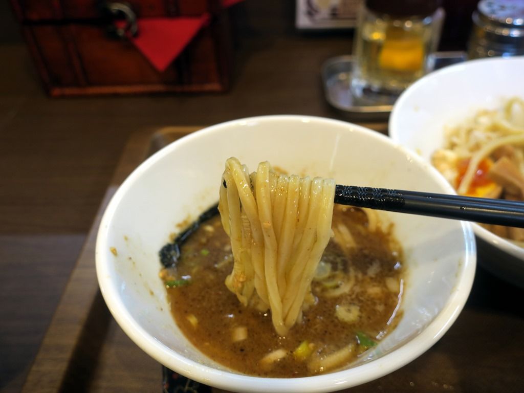 麺は浅草開化楼製のストレート太麺。極太なのにするする啜れて、一気に啜る感覚がまた堪りません。六厘舎とは異なりますが、味わい深くコク深いつけ汁が麺に良く絡んで、これは美味しい!