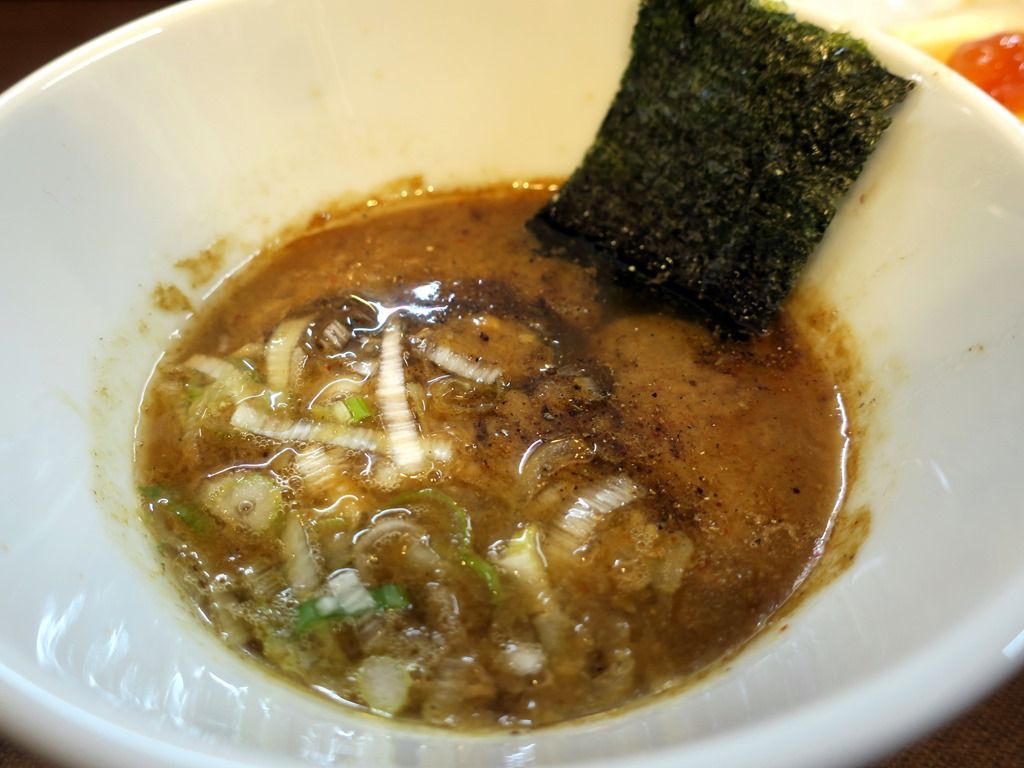 つけ汁側の具はきざみねぎ、海苔。つけ汁はとろっと濃厚な鶏豚白湯醤油味。薀蓄によると、大山鶏のスープをメインにゲンコツ・背ガラ・豚足・ひき肉をプラス。うま味が複雑で多層的で奥深く後を引きます。濃厚過ぎない適度な濃さも、食べ易さが際立ちます。
