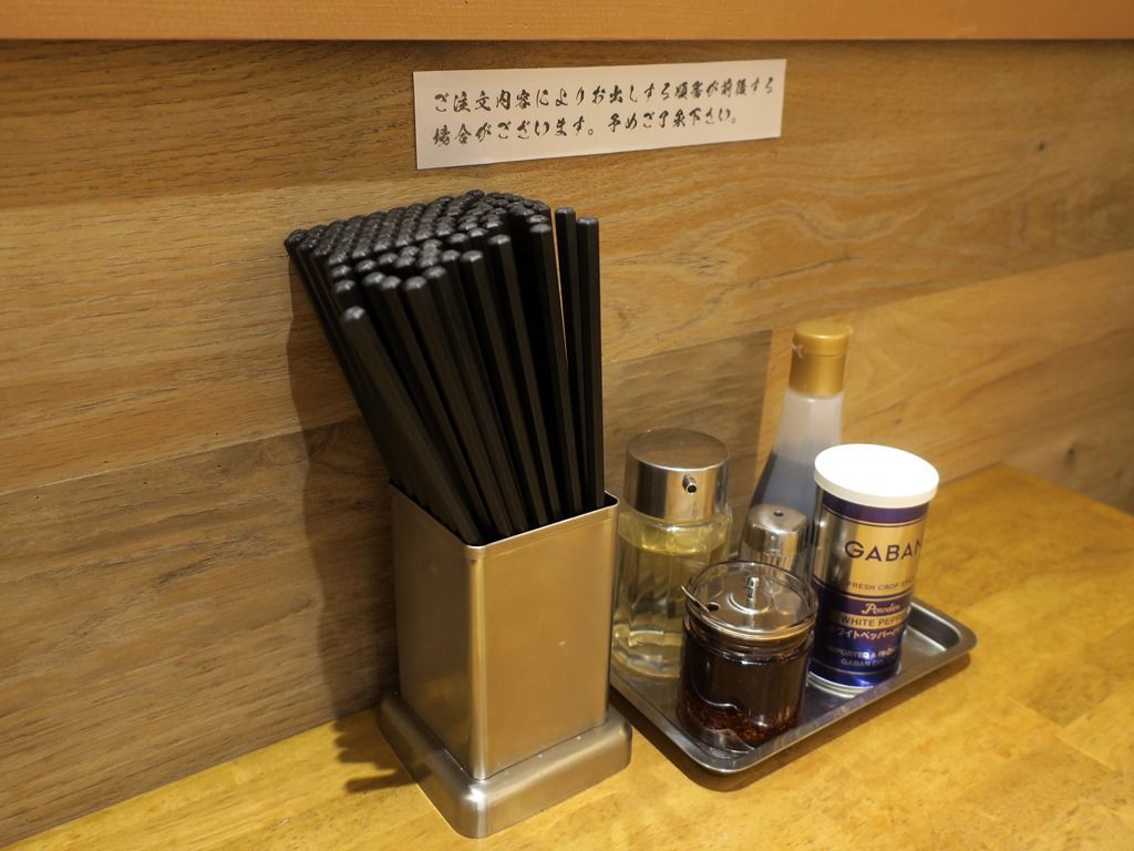 BGMはJAZZ。箸は洗い箸でエコ仕様。卓上調味料はGABANホワイトペッパー、醤油、酢、ラー油。