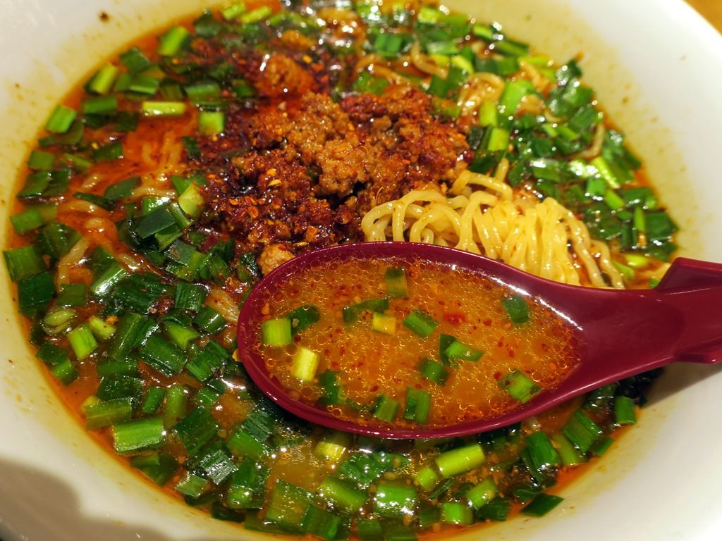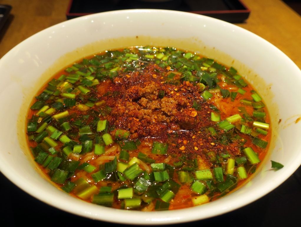 具は肉味噌、青ねぎ。スープは文字通り大辛仕立ての麻辣胡麻味。店頭看板によると、「本醸造醤油ベースーに芝麻醤、練り胡麻、すり胡麻、甜麺醤、陳皮等を使用した奥行きのある旨味。仕上げの特製辣油。辛いのが苦手な方、心臓の弱い方ご遠慮下さい。」とか。