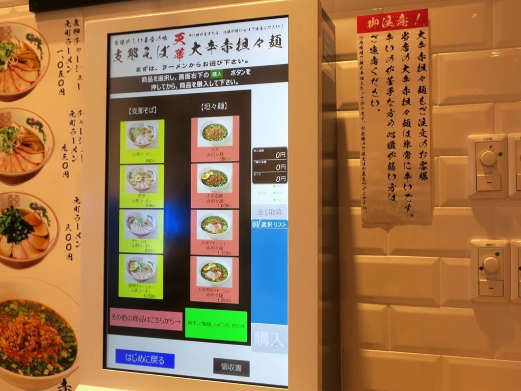 暖簾をくぐってすぐ左手にある券売機でまず食券購入です。主なメニューは、元町ラーメン680円、大辛赤担々麺880円、他。券売機では「坦々麺」表記ですが、暖簾・ポスターは「担々麺」。担々麺はデフォが大辛で券売機での辛さ選択は不可。