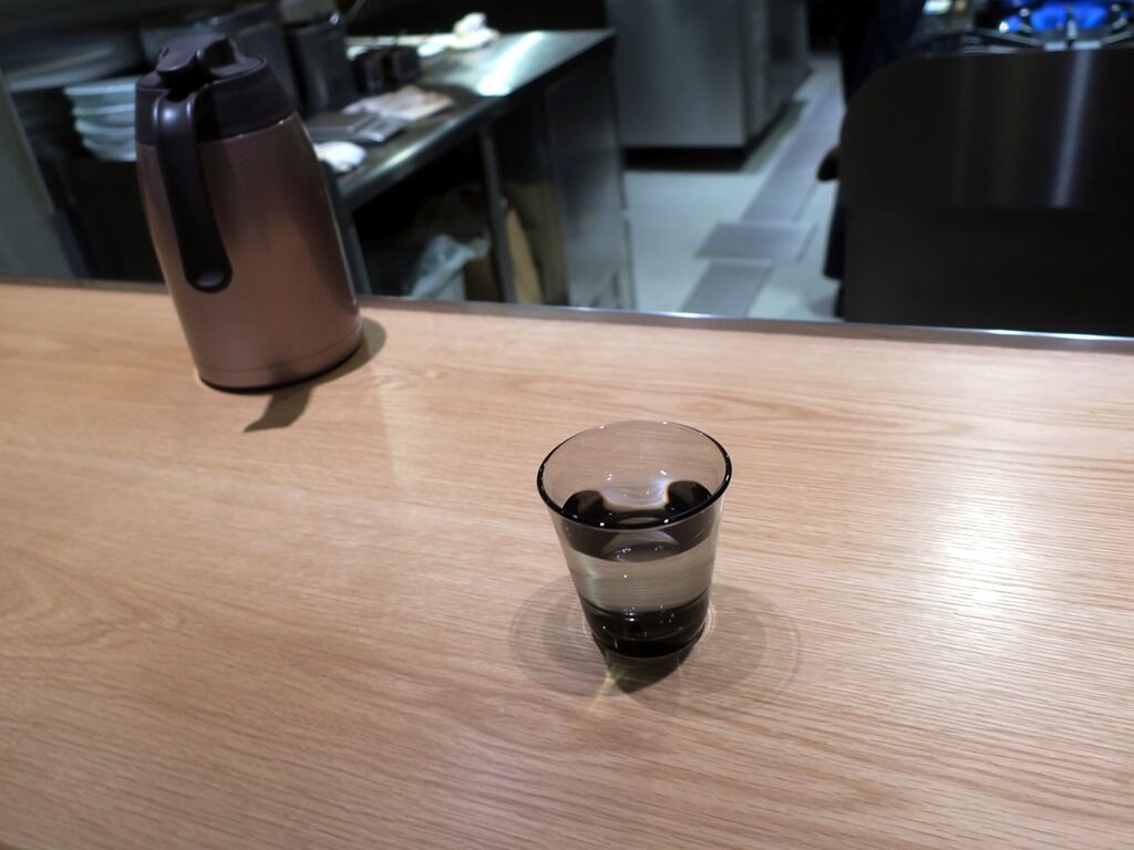 コンクリート打ちっぱなしの店内は実にモダンで開放的な空間。席は厨房を囲む凹字型カウンター9席(4席・5席・1席)。どの席からでも調理の様子が良く見えるまさにオープンキッチン。20:50頃到着で先客3、後客1。厨房には男性スタッフ2名。質問にも快く応えていただきました。