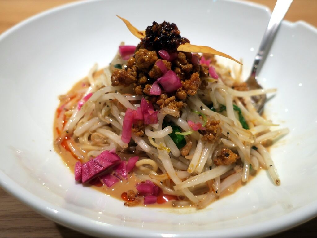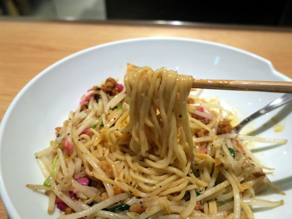 タレはあらかじめ麺に和えてあってそのままいただけます。辛さはほんのり程度、痺れは感じられず。自家製芝麻醤による濃厚な胡麻の風味と旨味がありますが、甘くなく軽快な味わい。酸味が結構効いていて、今までの汁なし担々麺とはまったく異なる調味。希須林の味や一般的な汁なし担々麺を想定すると、違いに驚きますが、ニュータイプの汁なし担々麺ですごく美味しい!