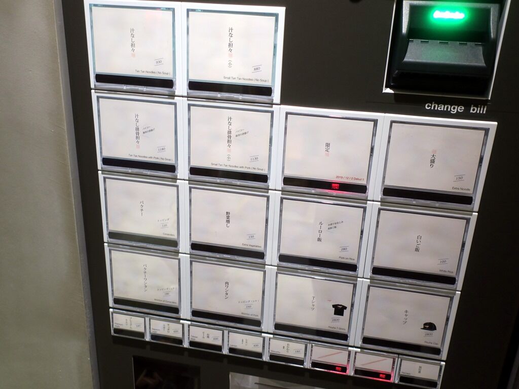 入店するとまず券売機で食券購入です。主なメニューは、汁なし担々麺930円、汁なし拝骨担々麺1180円、ルーロー飯280円、他。食券を買って先に向かおうとすると、温かいおしばりと紙エプロンが券売機の上にありますと声がかかって、いったん回れ右。