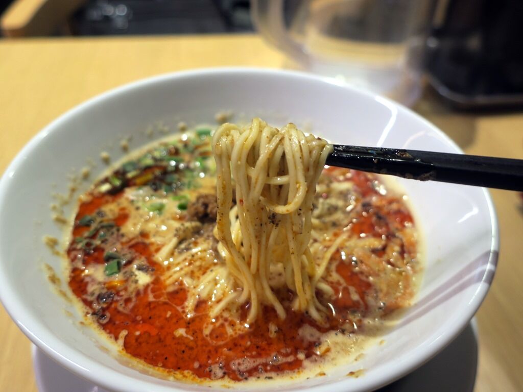 麺はストレート中細タイプ。細身ながらもちもちっとした食感で、気持ち柔めのゆで加減がまったりとした担々スープにとても良く合ってます。