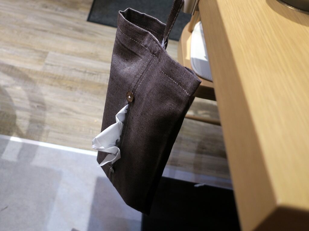 スタッフは厨房に男女各1、ホール担当の女子1、外に呼び込みの男性1、計4名体制。テッシュは壁カウンターでは壁フックに、テーブル席は食卓の側面に設置。