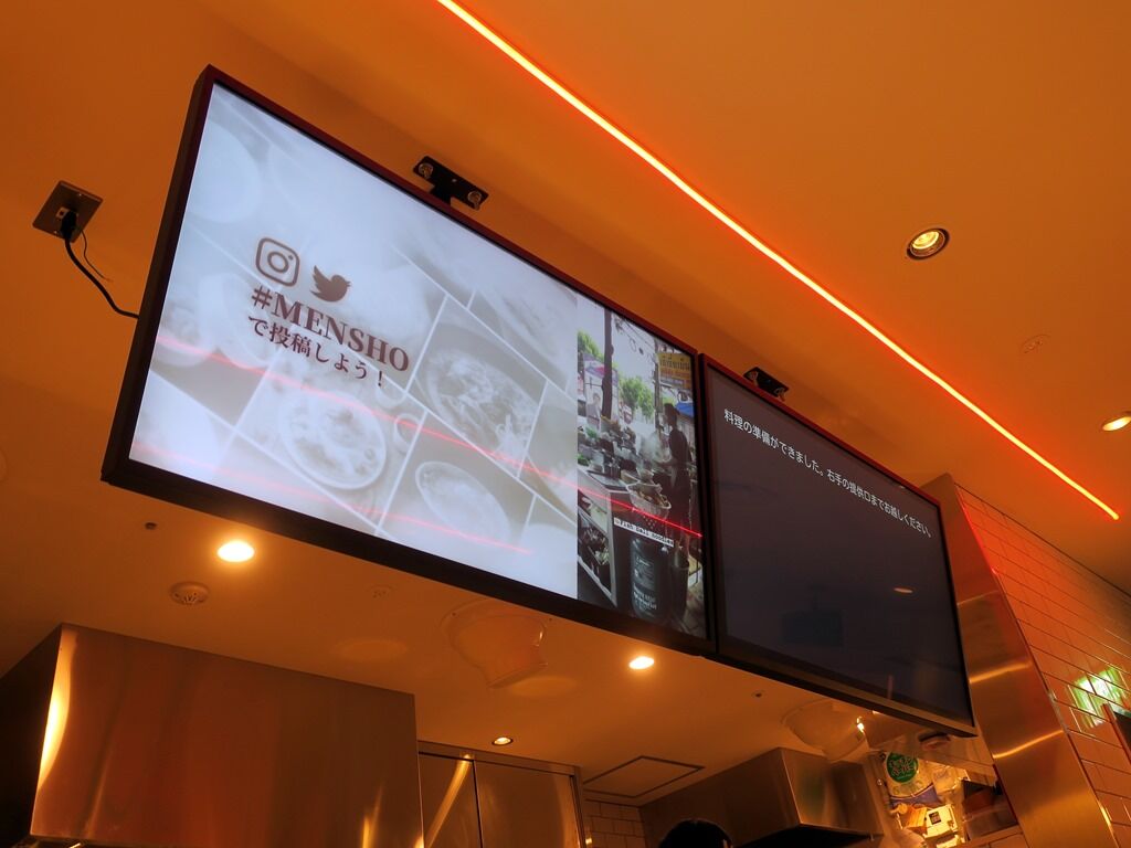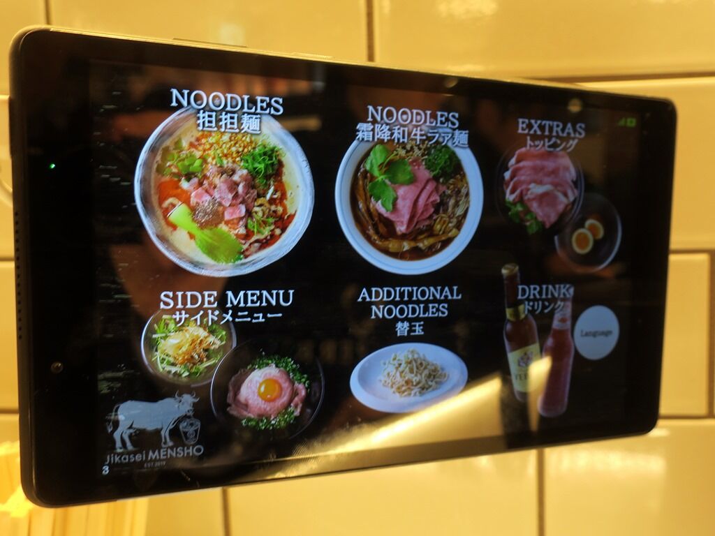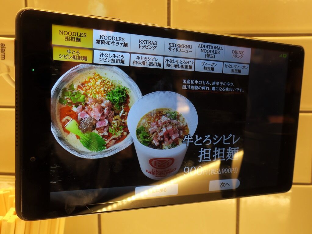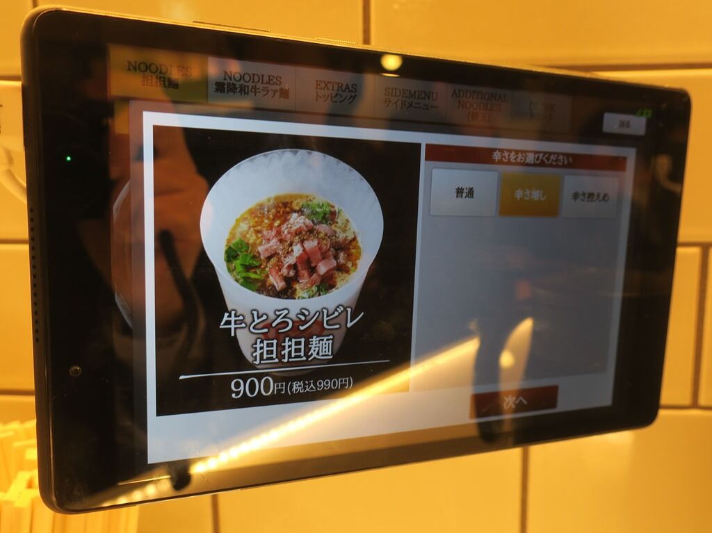 券売機は無く席のタッチパネルで注文、本来はセルフで取りに行く方式ですが、混雑のためかスタッフがサーブ。食後はセルフレジにて精算というシステム。